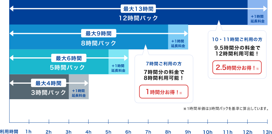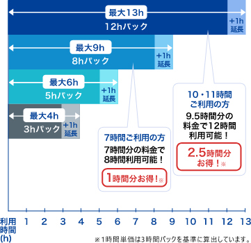 | タイプ | 3時間パック | 5時間パック | 8時間パック | 12時間パック | 延長料金/ 1時間 |